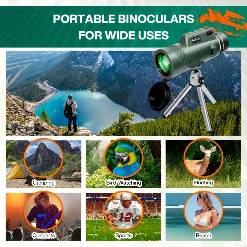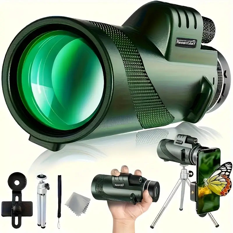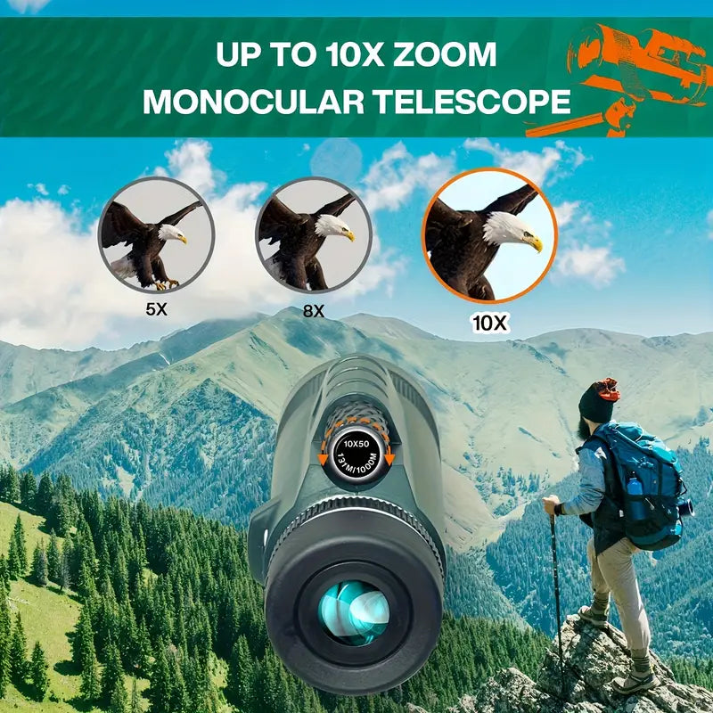 Experience clear and detailed distant views with this 10x50mm high-definition monocular telescope. Featuring a fully multi-coated (FMC) lens and 10x magnification, it delivers sharp images ideal for outdoor activities like camping, hiking, wildlife observation, bird watching, and sports events. The manual focus allows precise adjustments for optimal clarity. This portable green monocular comes complete with a tripod and a mobile phone adapter, enabling stable viewing and easy photo capture. Its compact design ensures convenient handheld use and effortless transport during your outdoor adventures.