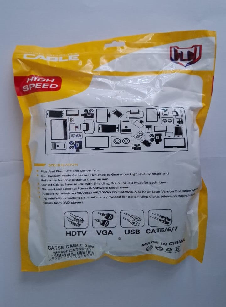The High Speed 30M Cat5 Cable delivers reliable network connectivity with a 30-meter length, ideal for extended reach without signal loss. Designed for optimal data transmission, this cable supports high-speed internet and stable connections, making it suitable for both professional and home networking setups. Its durable construction ensures long-lasting performance in demanding environments.