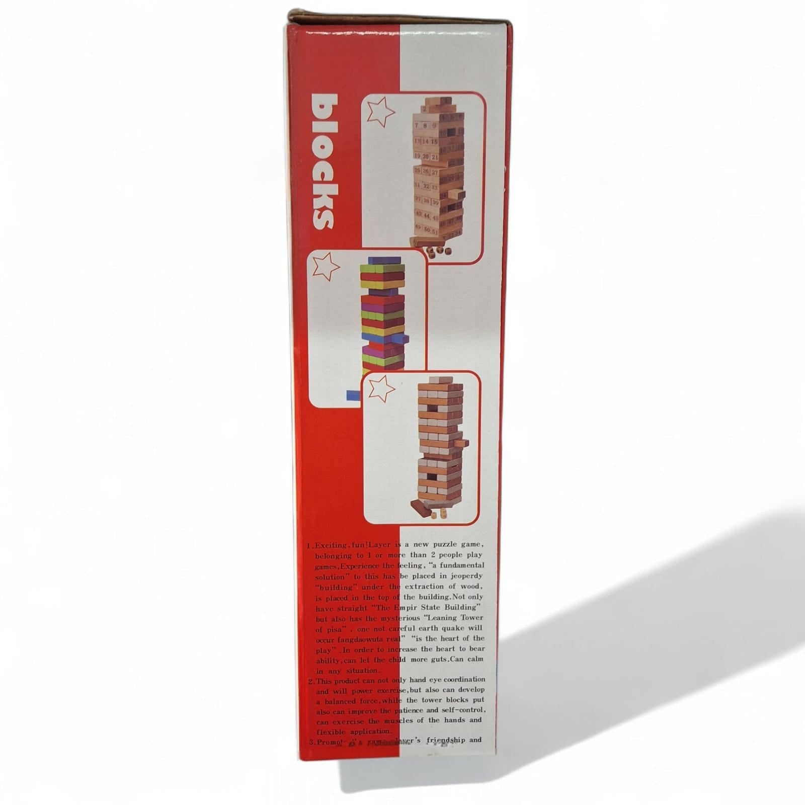 This set of 54 wooden tower stacking blocks offers a versatile and durable play experience. Crafted from high-quality wood, the blocks provide a smooth finish for safe handling. Their uniform size and weight enable stable stacking, promoting fine motor skill development and spatial awareness. Ideal for educational and recreational use, these blocks encourage creativity, problem-solving, and hand-eye coordination in children while ensuring long-lasting use.