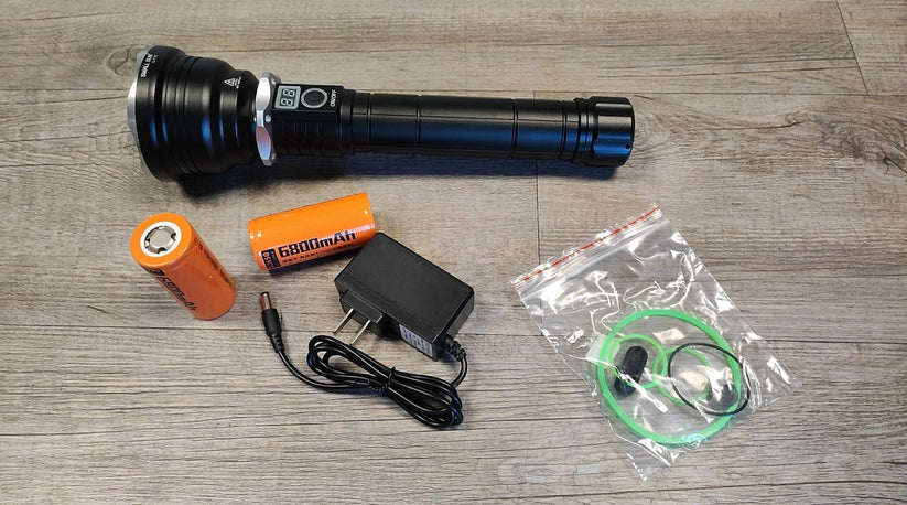 What you get: 1 x LED Flashlight, 2 x 6800mah 32650 Lithium batteries, 1x 220v AC Wall Charger, 1x Belt, 1x Carry Bag, 1x Metal Carry Case