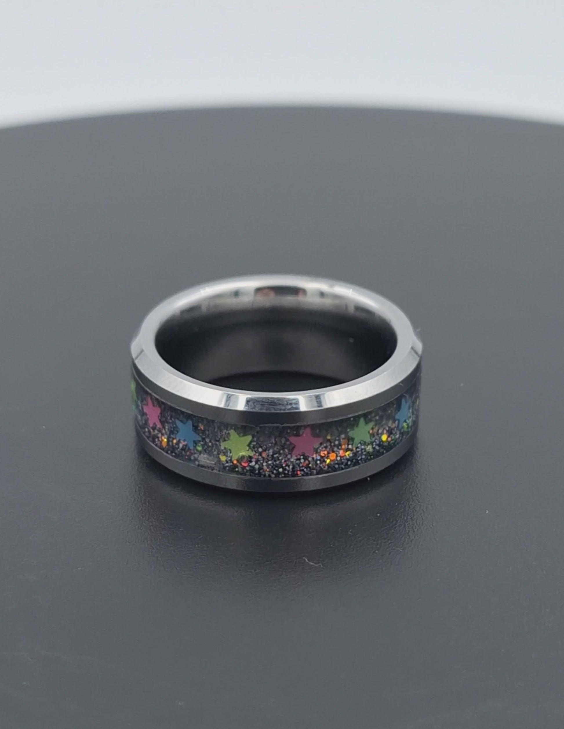 Tungsten Metal 8mm Ring With Glitter & Multicolored Stars - Size 6