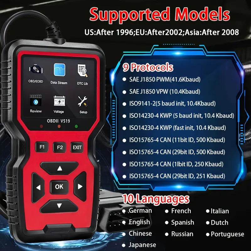 The V519 Professional OBD2 Scanner offers precise engine diagnostics with real-time data analysis. USB powered, it requires no battery, ensuring uninterrupted use during vehicle inspections. Compatible with most car models, it quickly identifies engine fault codes, making it an essential tool for professional mechanics and automotive technicians seeking efficient and reliable diagnostic performance.
